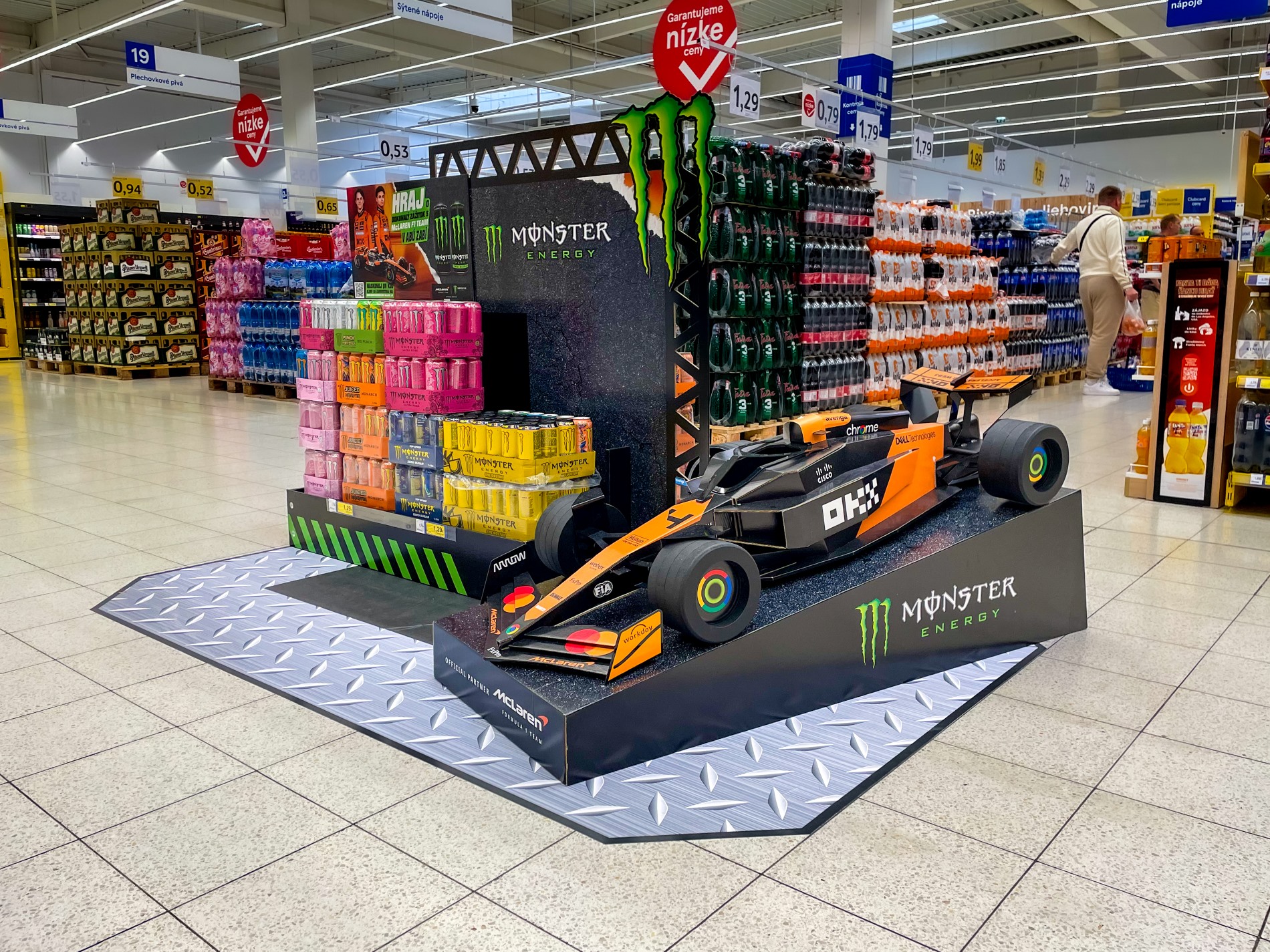 Značka Monster sa dlhodobo profiluje ako výrazný hráč v oblasti lifestyle a motoršportu. Spolupráca s tímom McLaren, ktorá zahŕňa okrem iného aj súťaže o vstupenky na preteky F1 alebo zážitky s tímom McLaren, je príkladom toho, ako možno globálnu športovú alianciu pretaviť v mieste predaja na silný impulz k nákupu. V obchodoch sa premietla do podoby výrazného POP média s replikou pretekárskeho monopostu. O realizáciu vystavenia v sieti obchodov Tesco na Slovensku sa postarala agentúra Dago, ktorá vytvorila a nainštalovala celkom 17 shop-in-shopov. Dominantným prvkom každého z nich je realistická replika formuly, ktorá slúži ako výrazný nosič kampane podporujúcej spotrebiteľskú súťaž. Dizajn vystavenia plne zodpovedá energickému vizuálnemu štýlu značky – čierna s neónovo zelenými detailmi, motív trhajúceho sa plechu, šikmé industriálne prvky a podlahová fólia evokujúca povrch boxovej uličky.